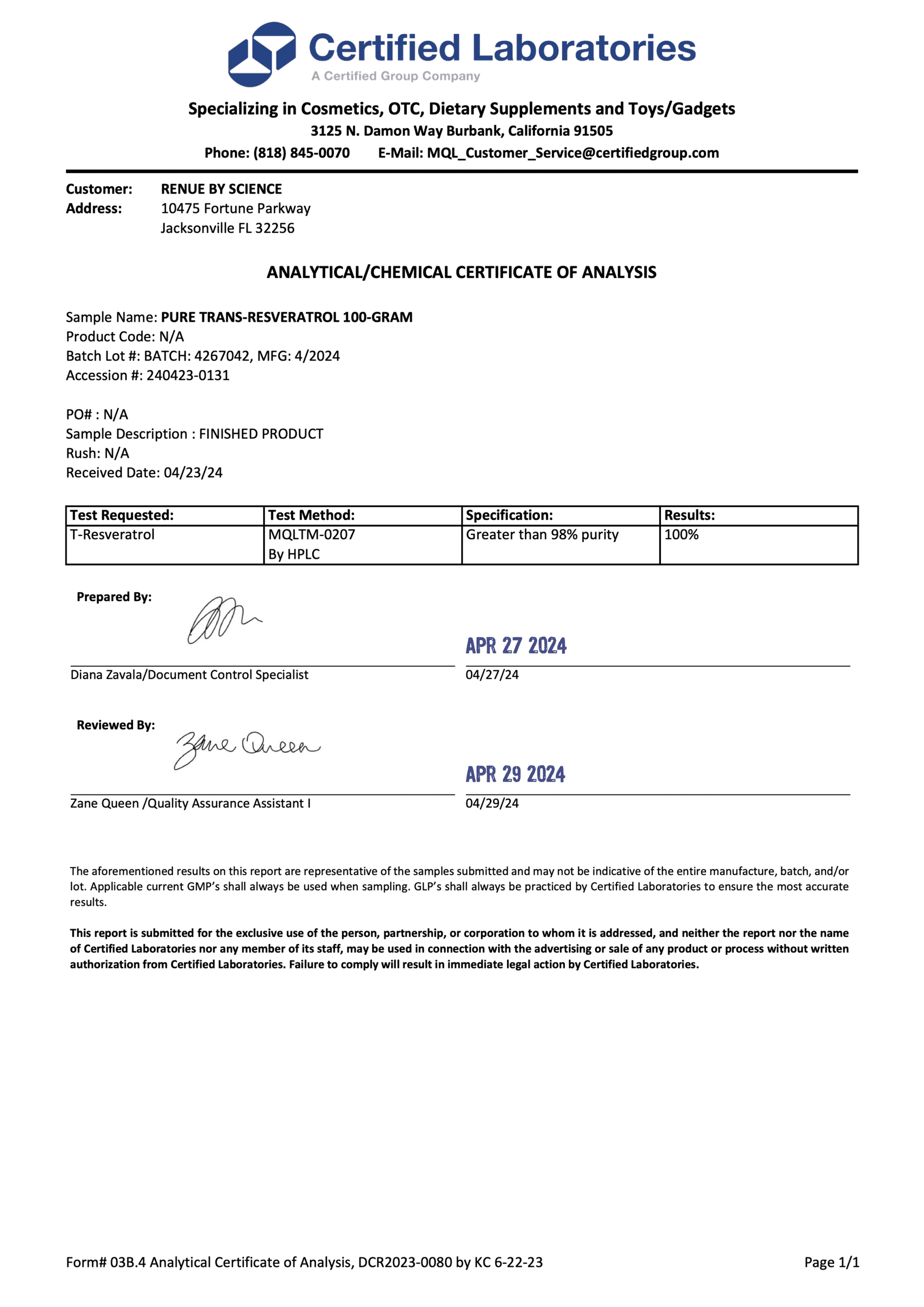 Trans- Resveratrol is a natural compound known for its anti-inflammatory and antioxidant properties.†Our PURE Trans-Resveratrol™ 100-gram Crystalline Powder is designed to support healthy aging, cellular function, and metabolic health.†