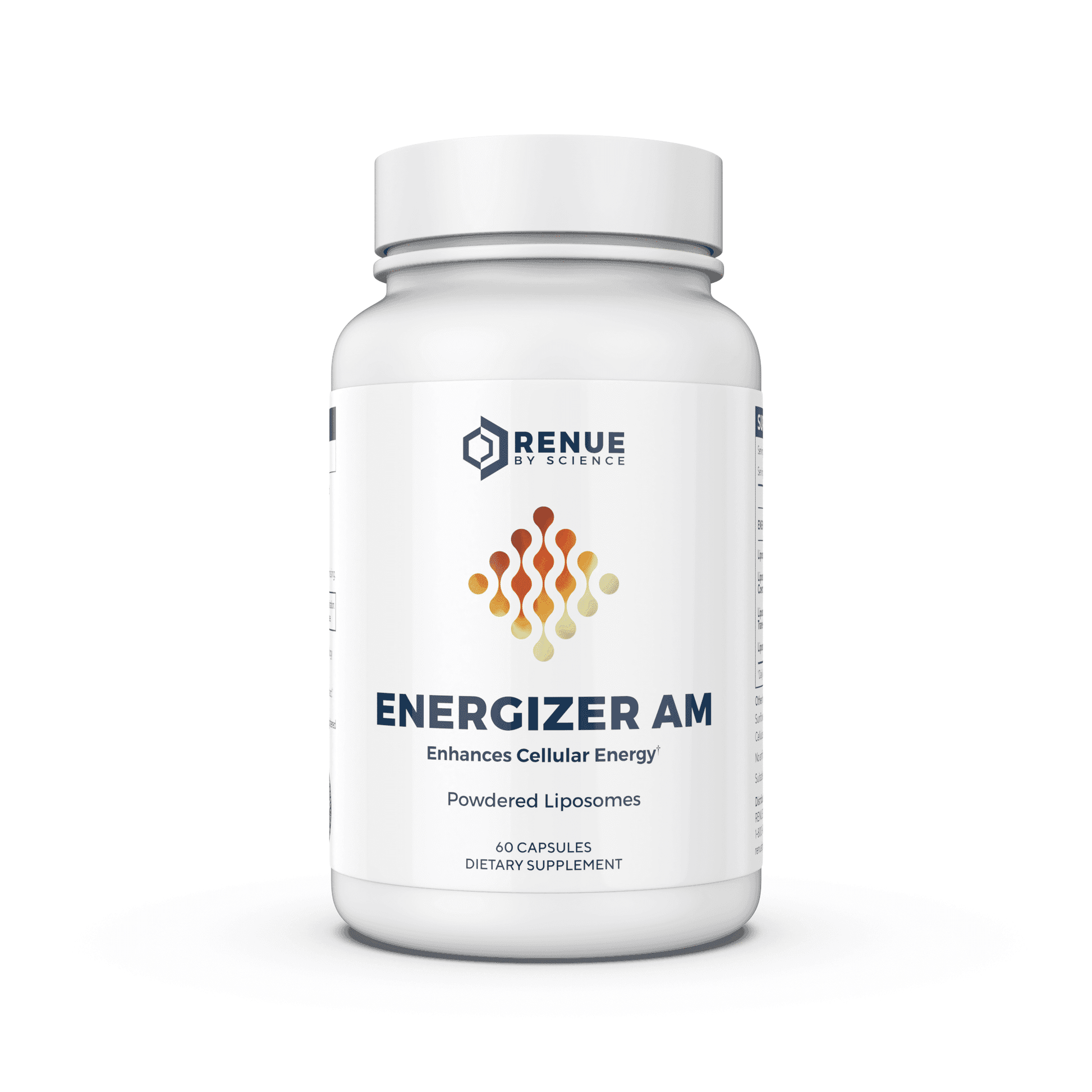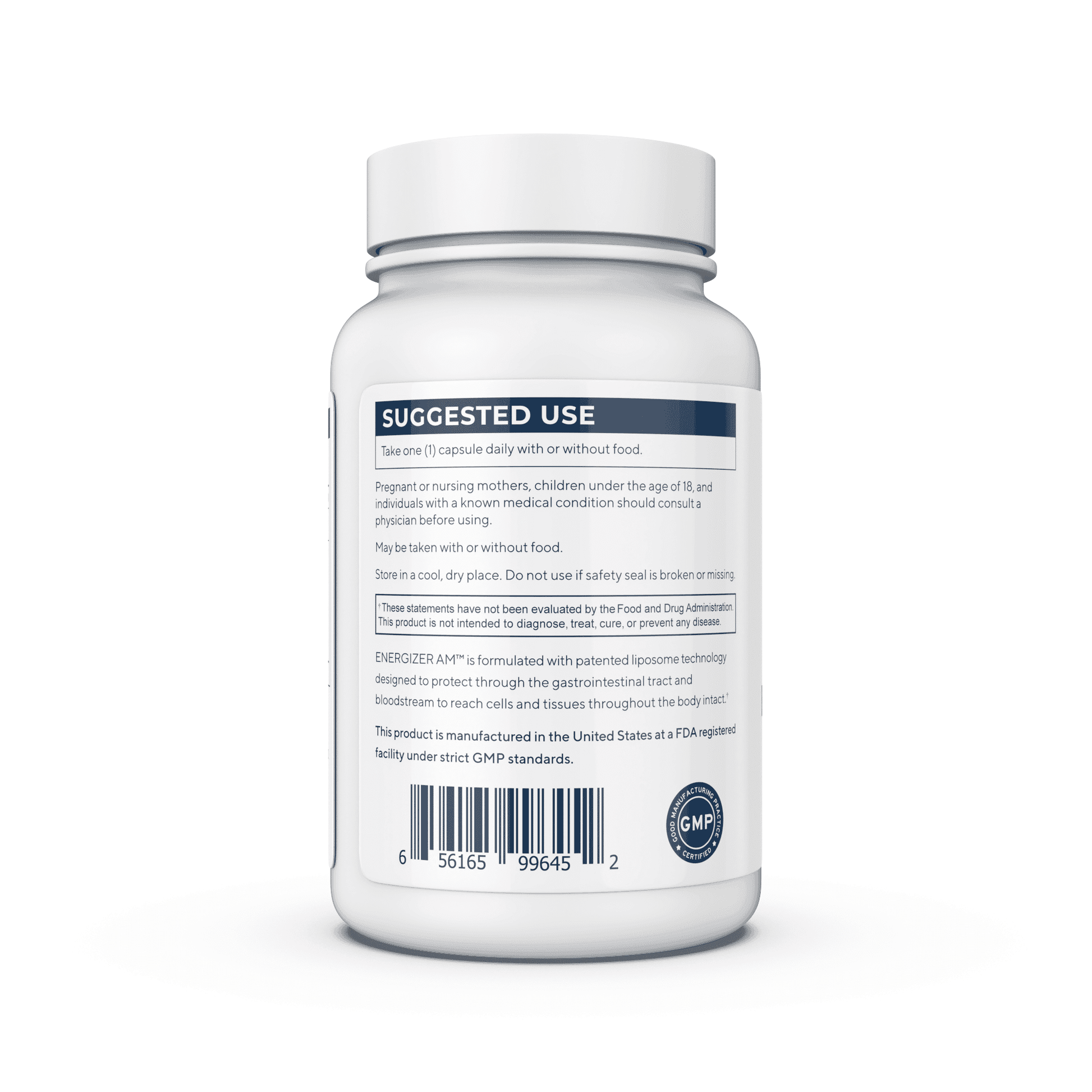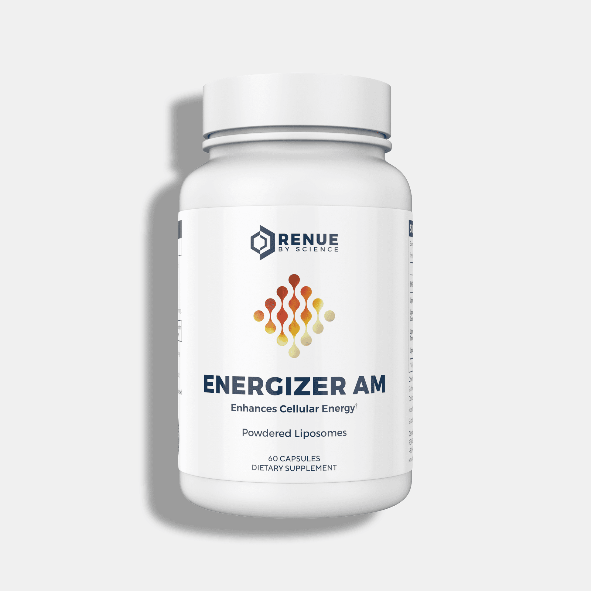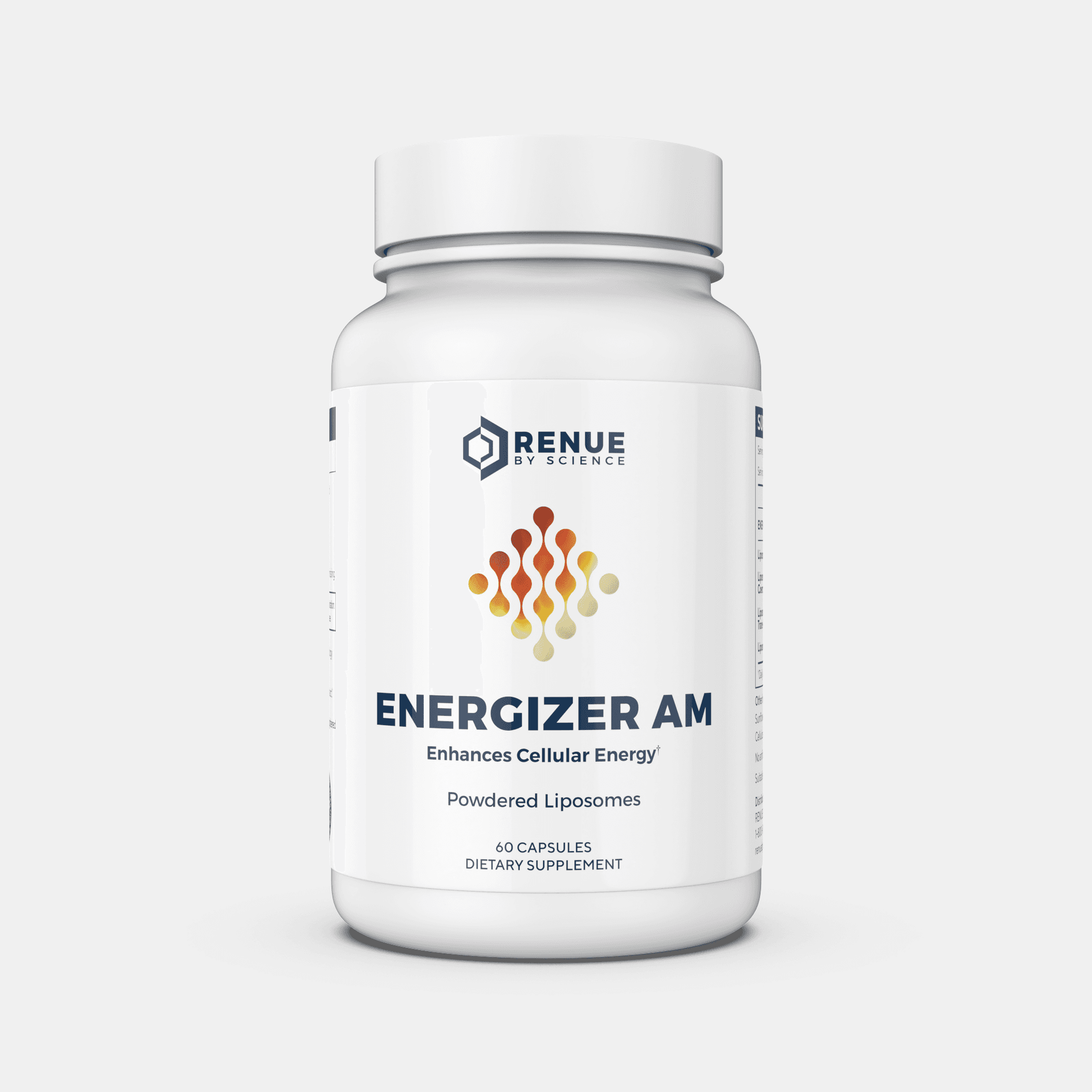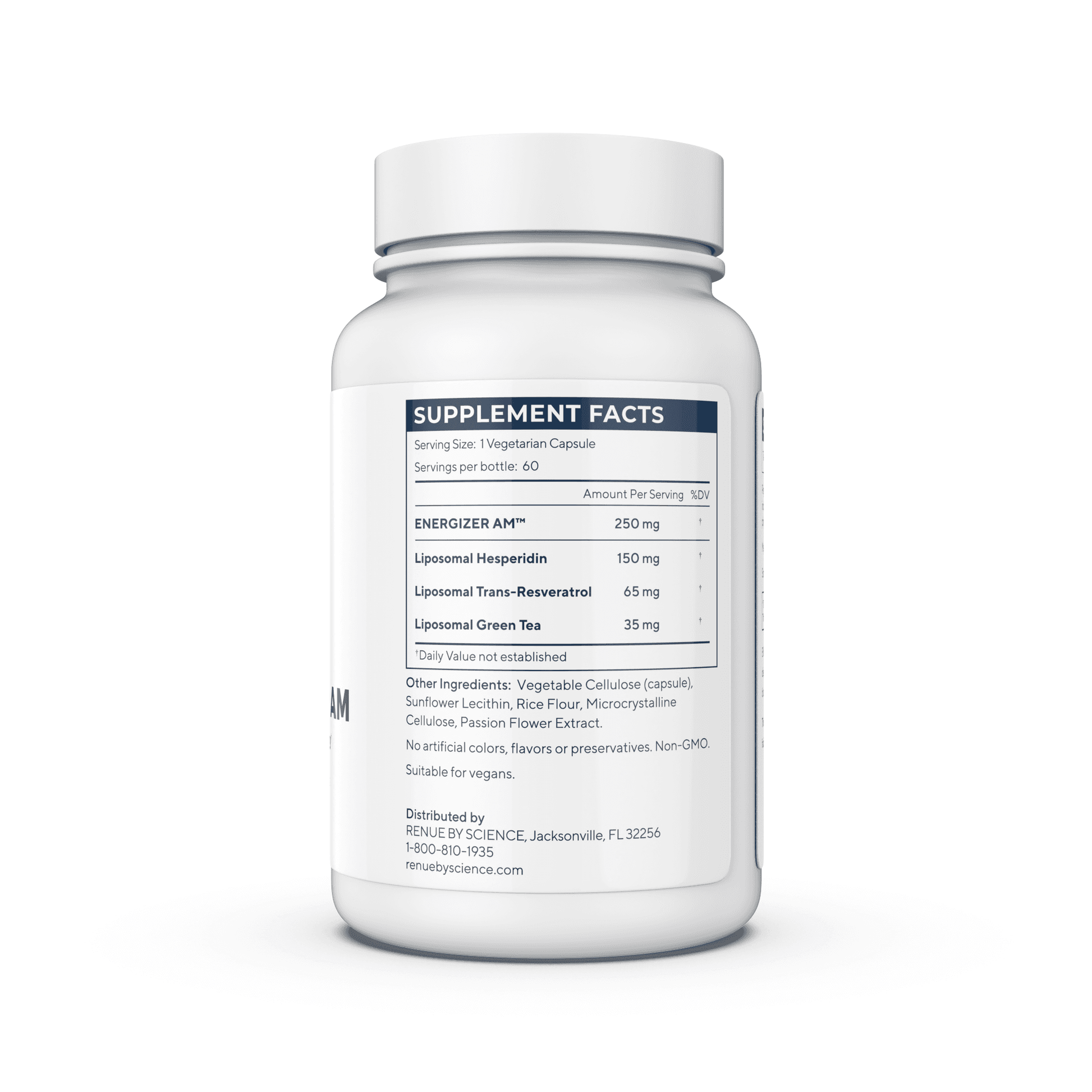 Energizer AM is formulated with ingredients that support cells' regenerative capacity, including protecting DNA integrity, mitochondrial biogenesis, and endothelial health.